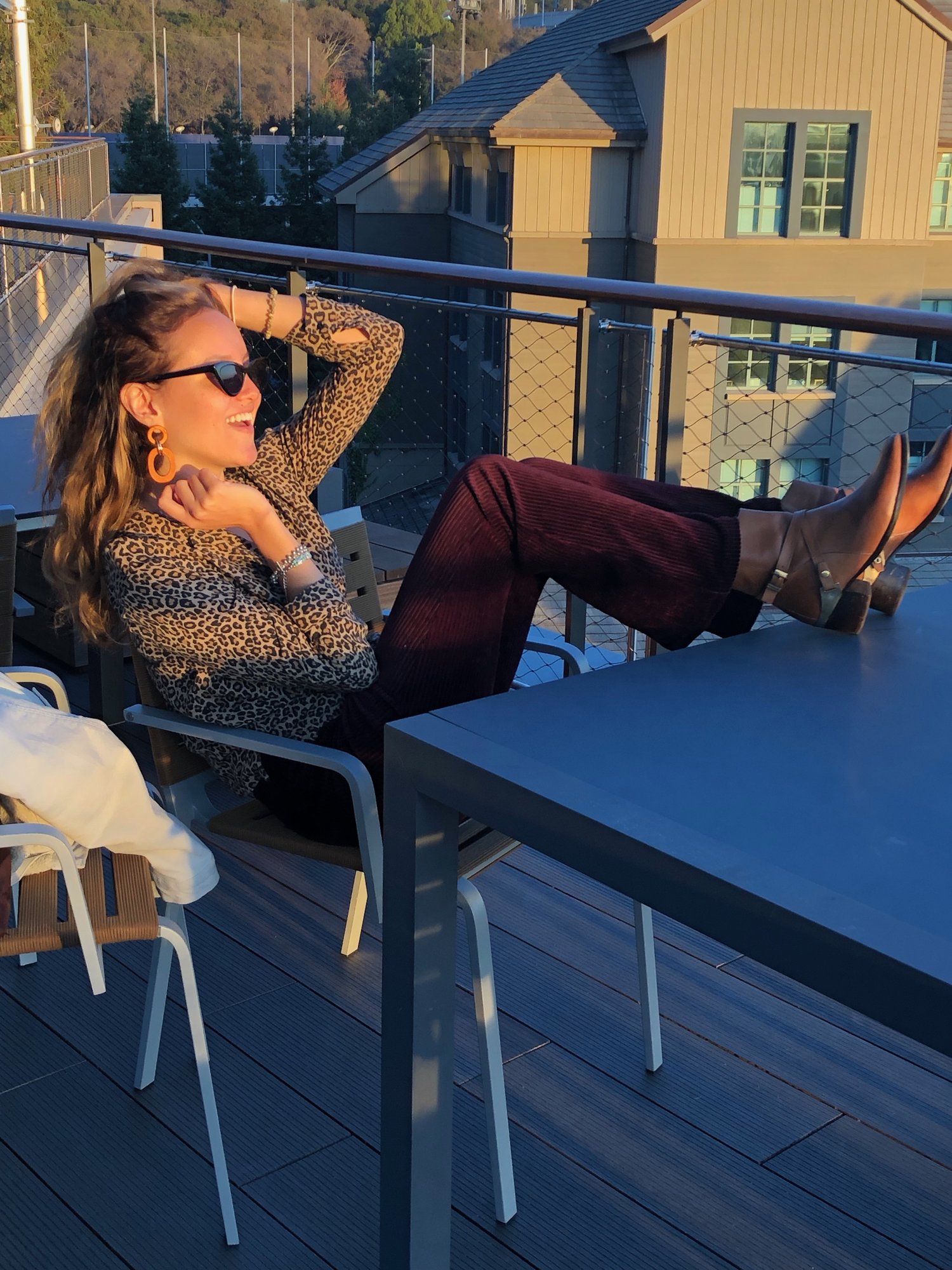 Watching the sunset in the rooftop was the perfect way to end my day. This time has the best lighting for pictures. It was very cold in Berkeley so I wore my Bershka purple corduroy pants and cheetah blouse from Pull & Bear. To make this look extra special, I had my wood earrings on, which I bought in a boutique in Spain. Accessories and jewelry are so important when it comes to fashion! This season, invest in pieces that you can also wear in Fall or Spring. For example I know I will use this pants around March, they are not too thick and the color will always look nice with anything.!