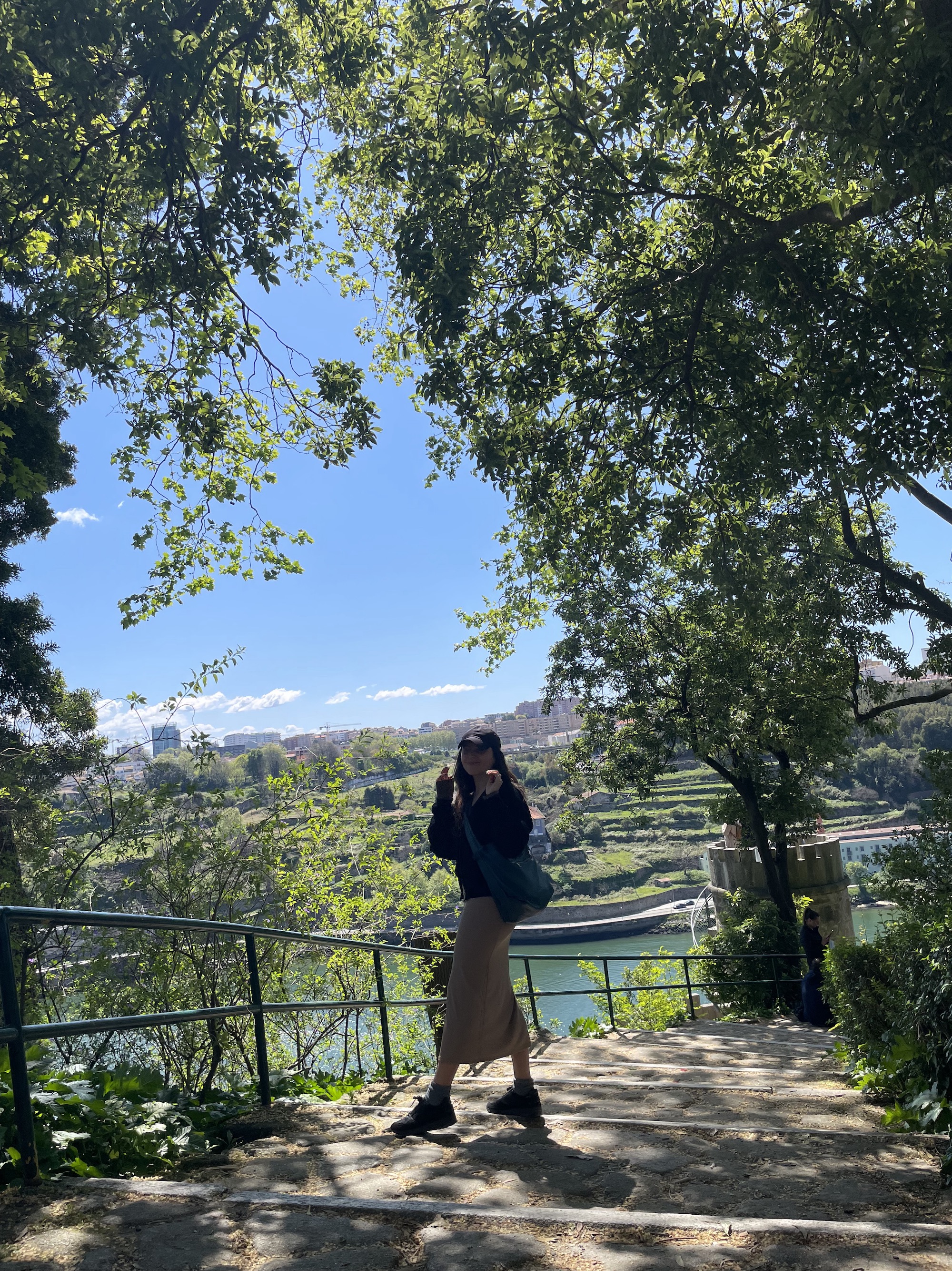 My look is perfect for a Spring or Summer day (doesn't get as hot as other parts of Europe). Here, I'm wearing a beige long skirt with a cotton black sweater, black cap and blue leather purse. My sneakers are from the Italian bran Geox, ideal for those long walks and hilly streets. It's incredible how accessories can elevate a look so much!!! No expensive designer bags needed, small retailers and even stores like Pull and bear and & Other Stories have tons of options you can choose from.
