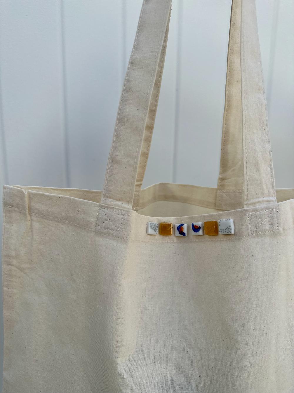Besides adding ceramics to the accessories and tote bags, I also added some hand painted details to each small tile. I got inspired in Portuguese architecture which is full of patterns and colorful shapes.